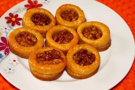 - tepsiye dizilir.Üzerlerine yumurta akı sürülen dairelerin üzerine yine çay bardağı ile kesilip ortası kapak yardımı ile çıkarılmış halkalar yapıştırılır.